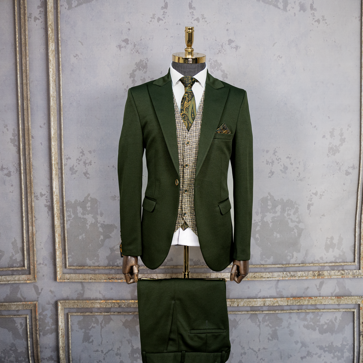 کت و شلوار سبز کش با جلیقه دبل فیس
