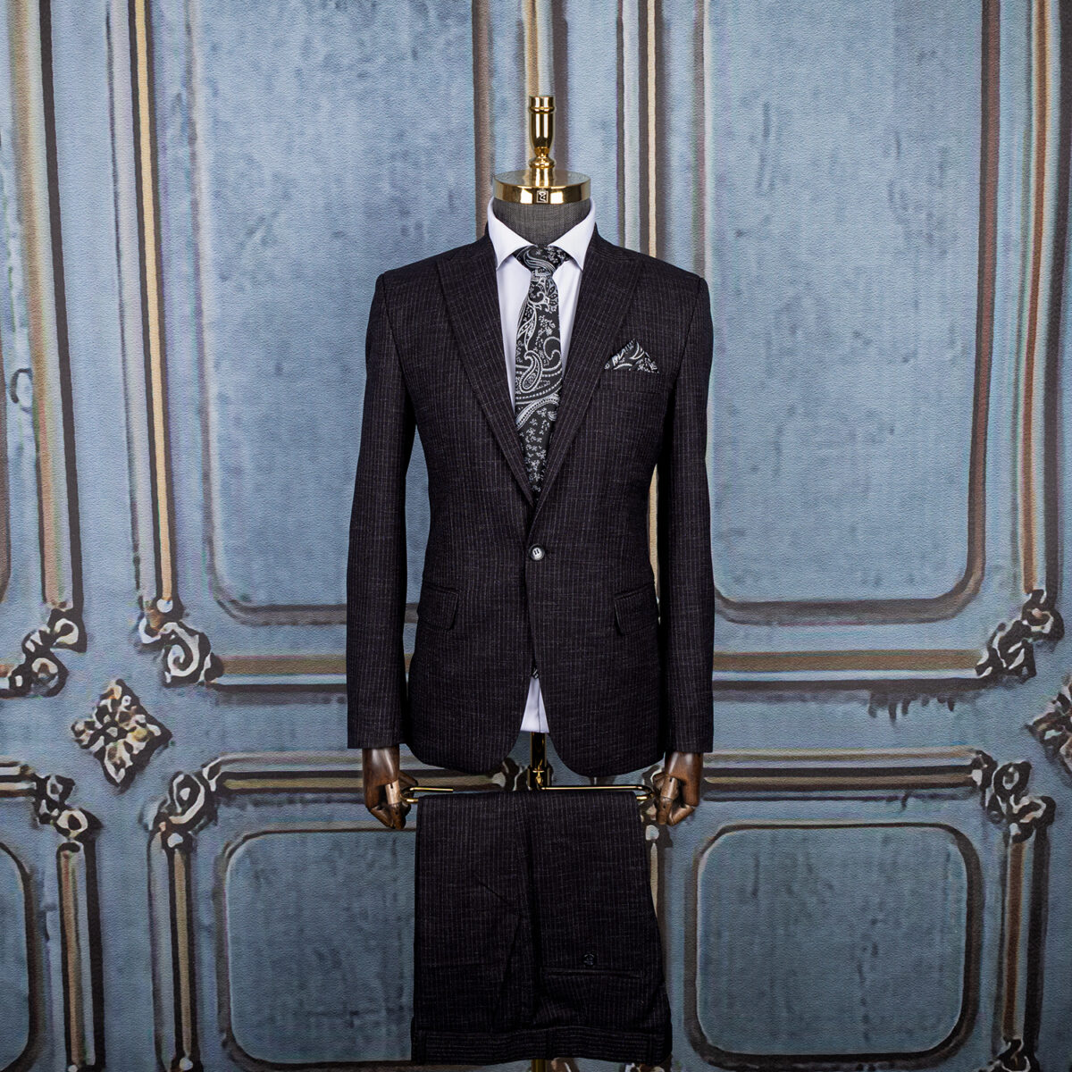 طرح دیپلمات یکی از الگوهای محبوب در کت و شلوار مردانه است. خطوط ظریف عمودی این مدل، باعث می‌شود بدن کشیده‌تر و لاغرتر دیده شود. مشکی بودن پارچه همراه با این خطوط، ظاهری منظم، قدرتمند و جذاب ایجاد می‌کند.