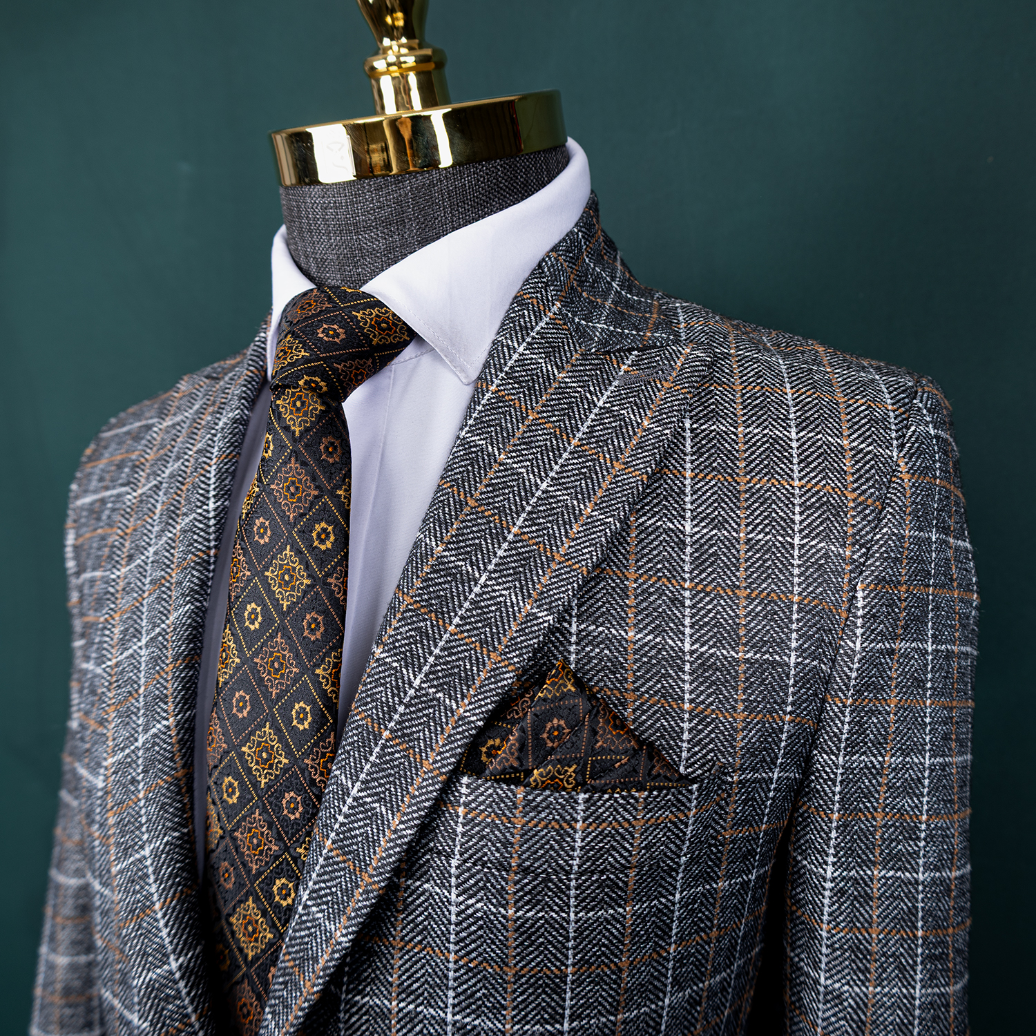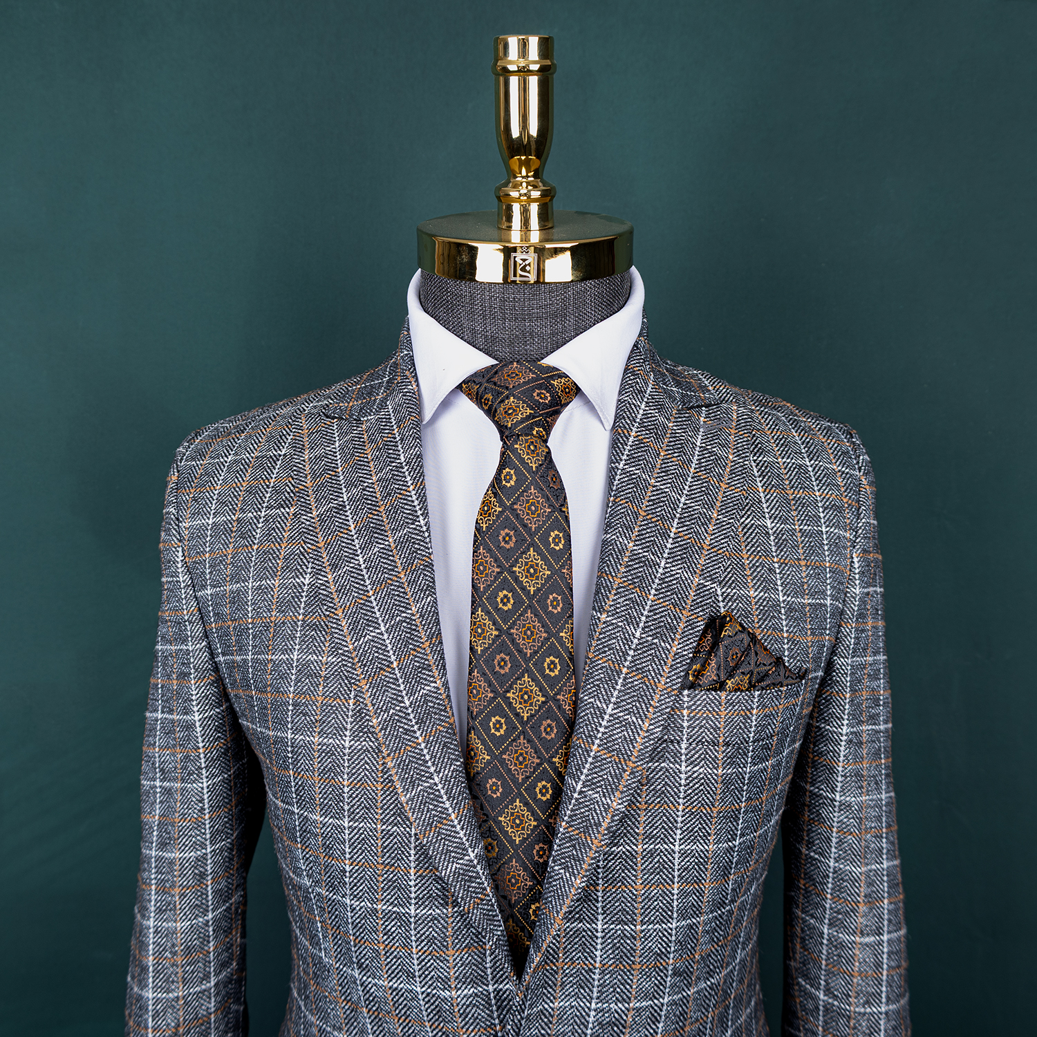 طرح پرنس دوگال (Prince of Wales Check) با مربعهای ریز و خطوط ظریف طوسی تیره و روشن، جلوهای ظریف و خاص ایجاد کرده است. این طرح از سالها پیش بهعنوان نماد شیکپوشی و اصالت در مد مردانه شناخته میشود.