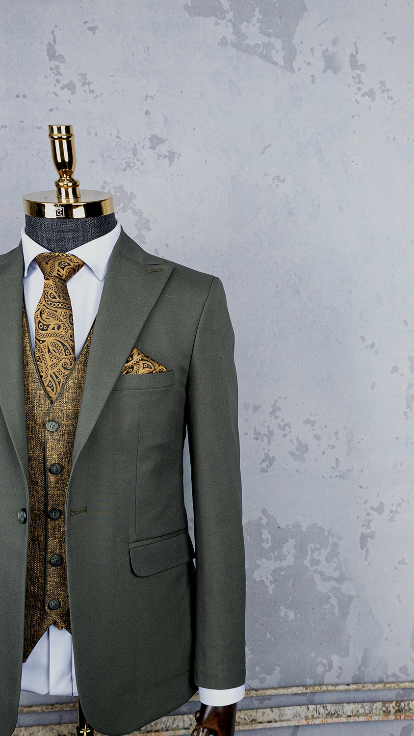 با کت و شلوار سبز بزیاق با جلیقه دو رو خاص و متفاوت دیده شو. این ست ترکیبی از ظرافت، قدرت و راحتی است. همین حالا با کارشناسان جیاوان تماس بگیر و استایل خاص خودت را بساز.