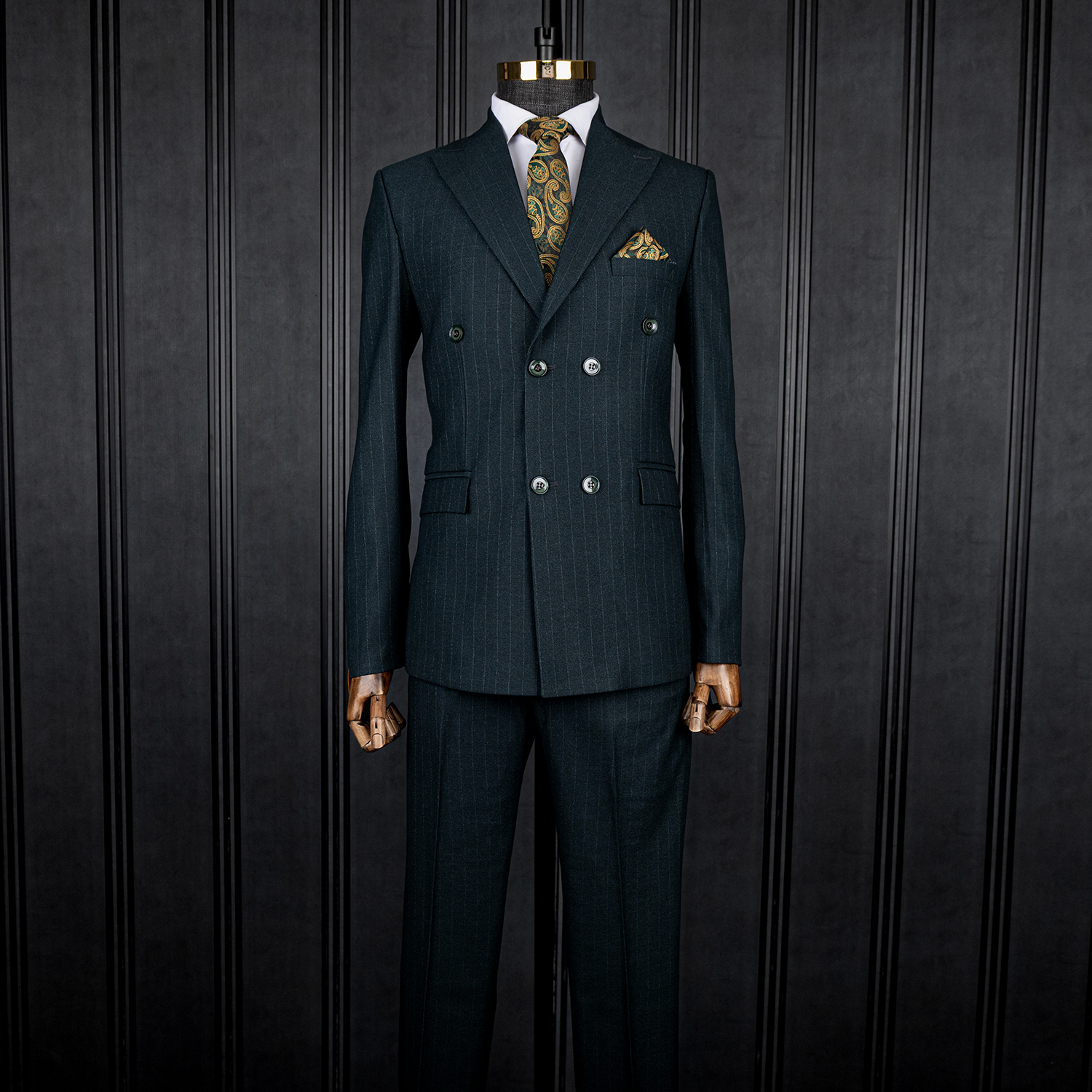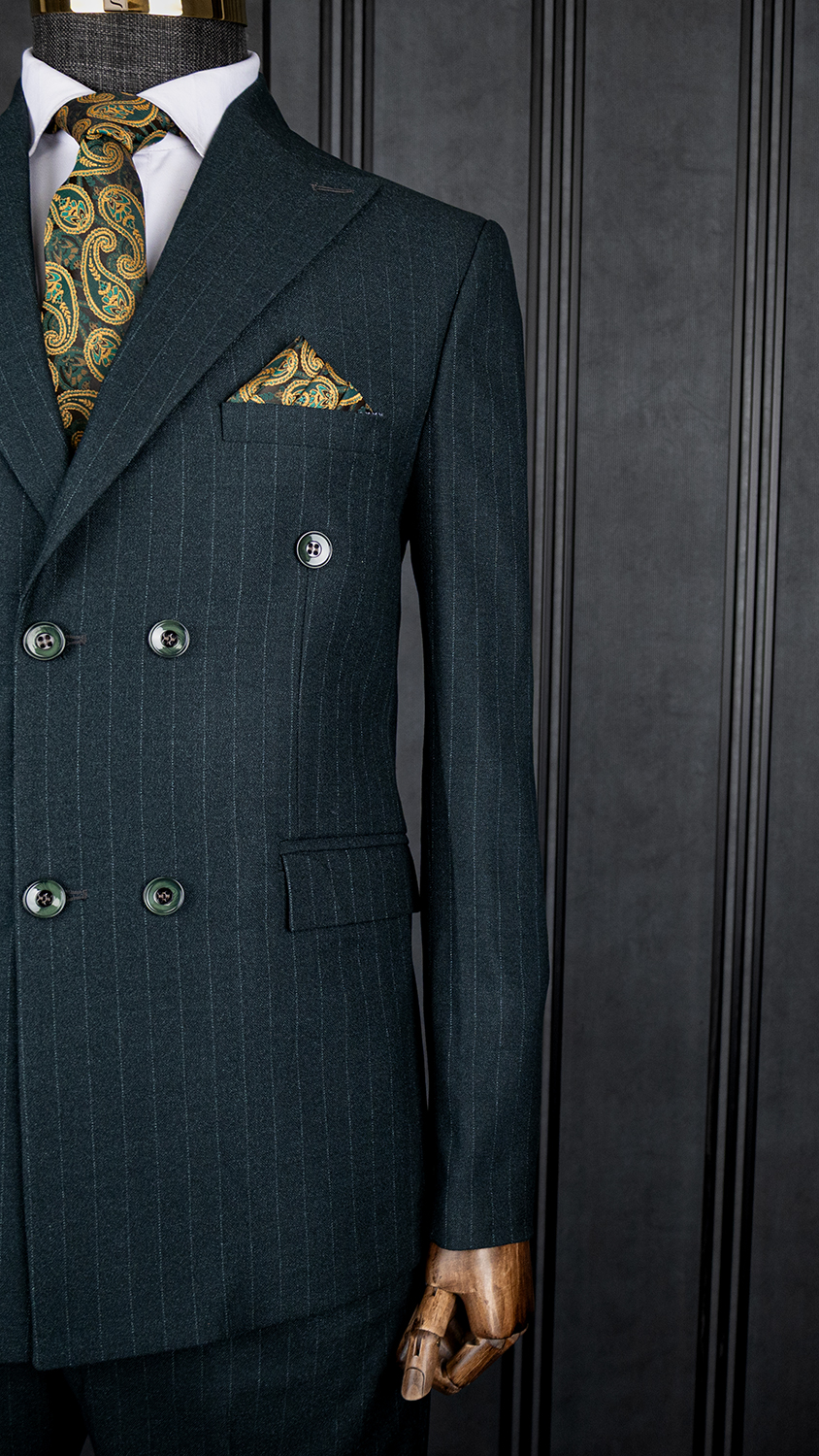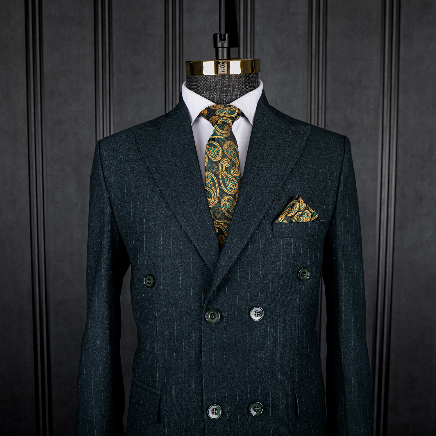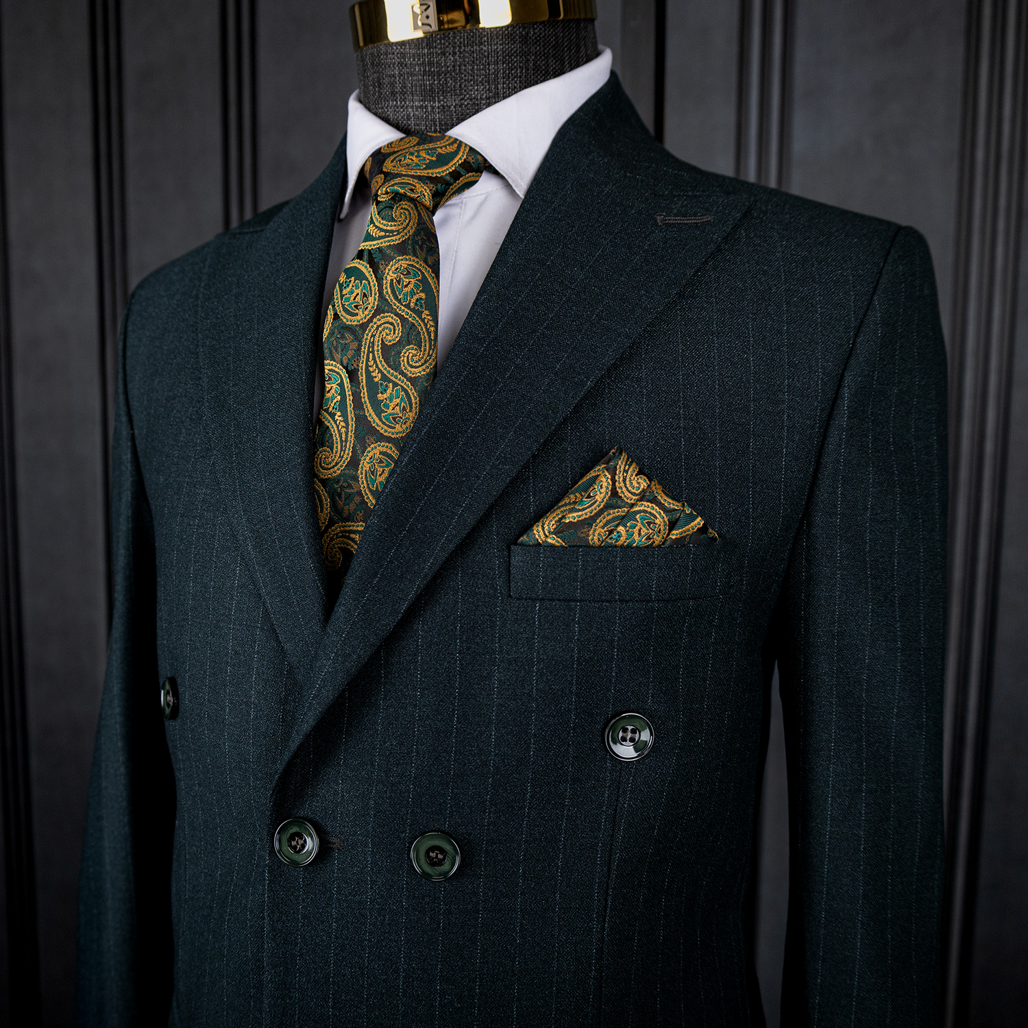 طرح دیپلمات یکی از اصیل‌ترین و محبوب‌ترین طرح‌ها در کت و شلوار مردانه است. خطوط عمودی ظریف باعث می‌شوند اندام کشیده‌تر دیده شود و استایل حالت رسمی‌تر و حرفه‌ای‌تری پیدا کند. در کت و شلوار سبز دبل برست دیپلمات این طرح به‌صورت منظم و متعادل اجرا شده تا ظاهر کلی کت و شلوار شلوغ نشود.