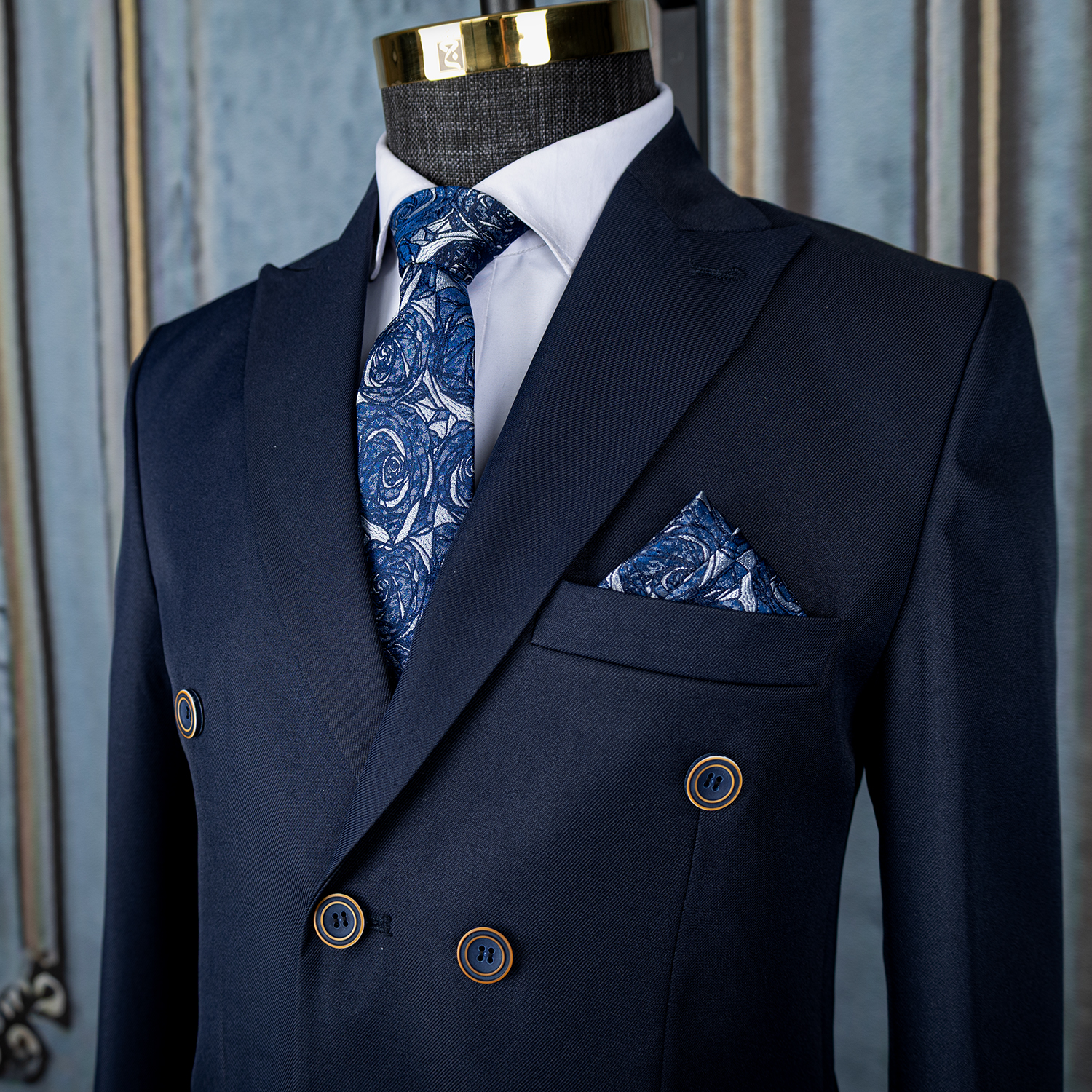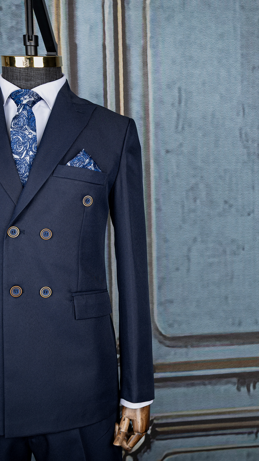 کت و شلوار سرمه‌ای دبل‌برست فاستونی جیاوان – ترکیب اصالت، وقار و جذابیت بی‌زمان