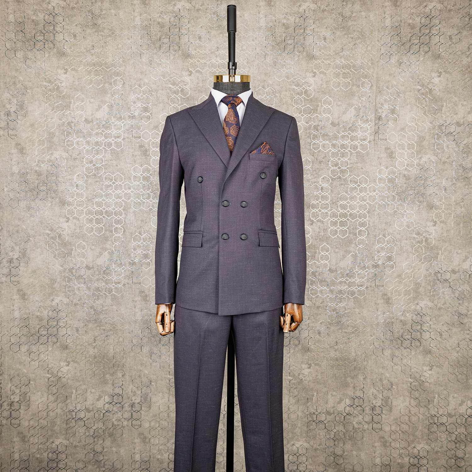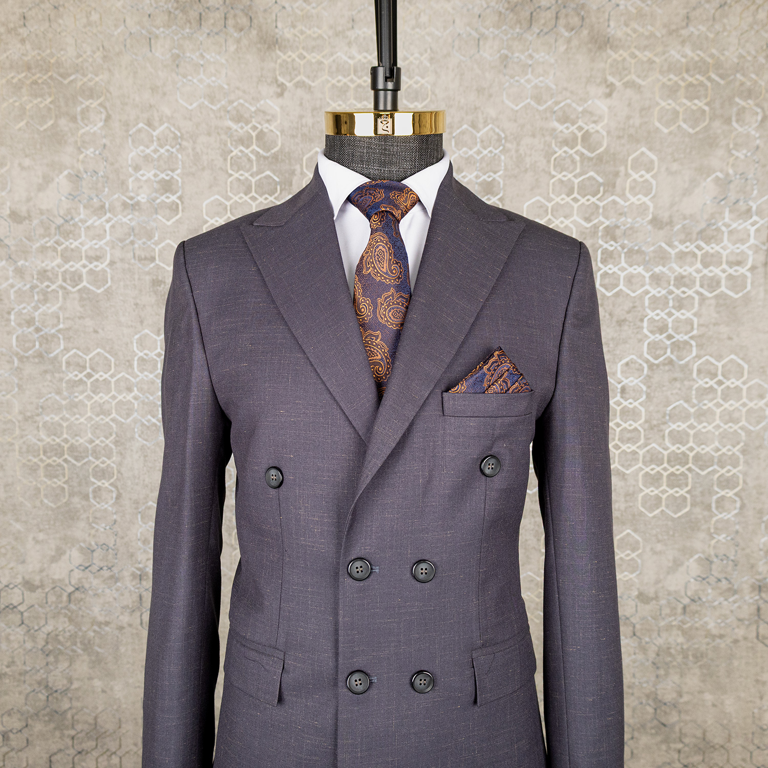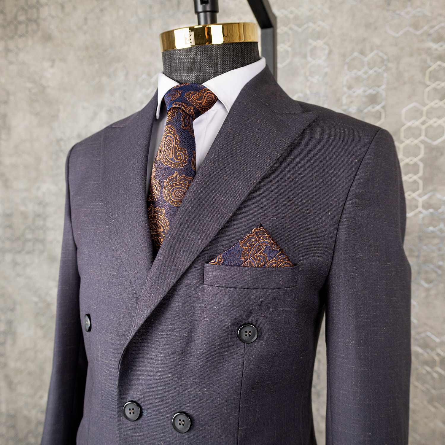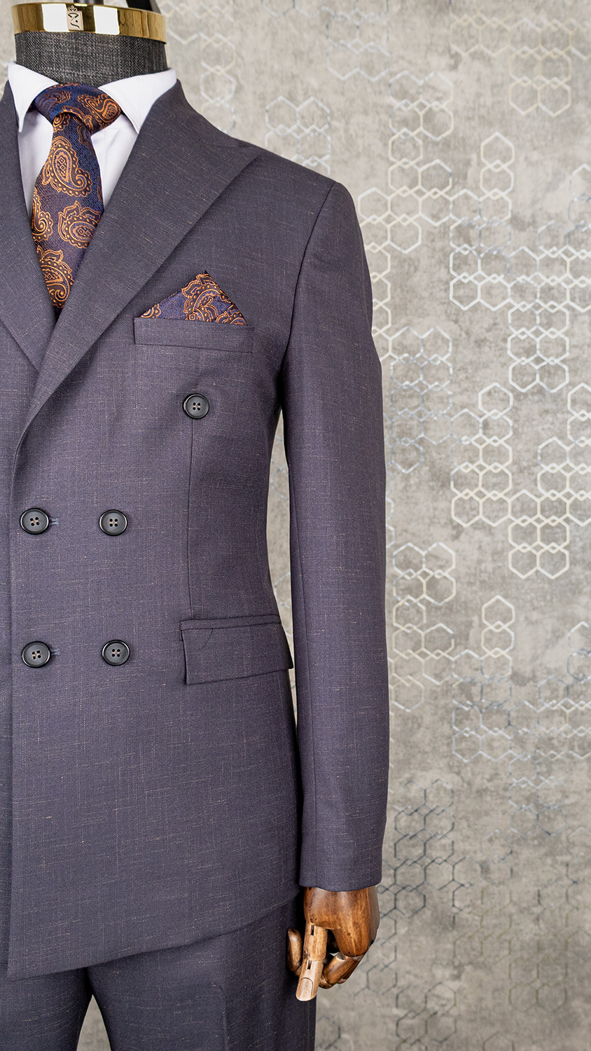 در دوخت این کت و شلوار طوسی دبل برست از پارچه انگلیسی استفاده شده است. پارچه انگلیسی به دلیل بافت منظم، دوام بالا و ایستایی عالی شناخته میشود. این پارچه بهخوبی روی بدن قرار میگیرد و فرم کت را ثابت نگه میدارد.